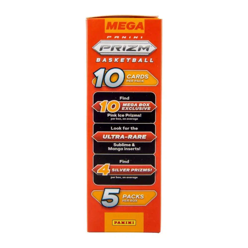 Panini presents the 2024-25 NBA Prizm Basketball Trading Card Mega Box. Each box contains 5 packs with 10 cards per pack. Look for 10 Mega Box Exclusive Pink Ice Prizms! Look for the Ultra-Rare Sublime and Manga Inserts. Content may vary.