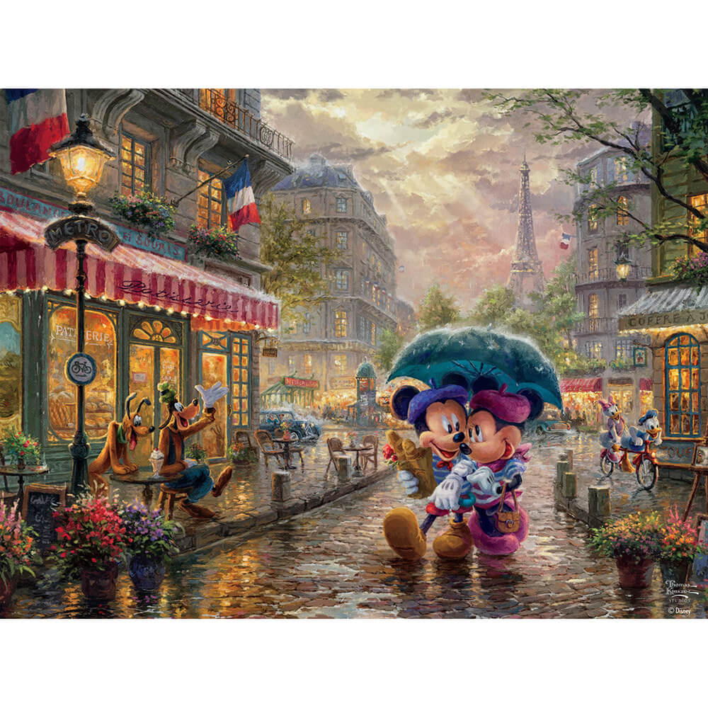 Thomas Kinkade Disney Collection is a group of paintings inspired by great moments from famous Walt Disney movies this 750 piece puzzle features Minnie Mouse and Mickey Mouse in Paris, walking under an umbrella with the Eifel Tower in the distance.
