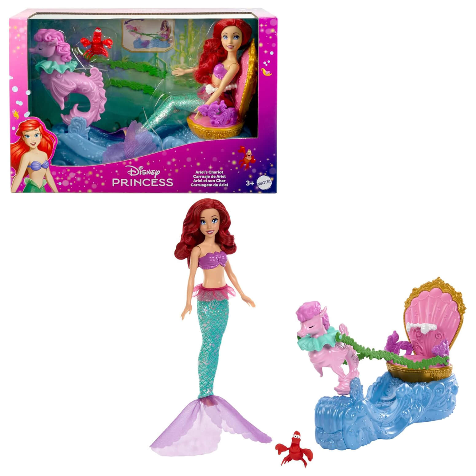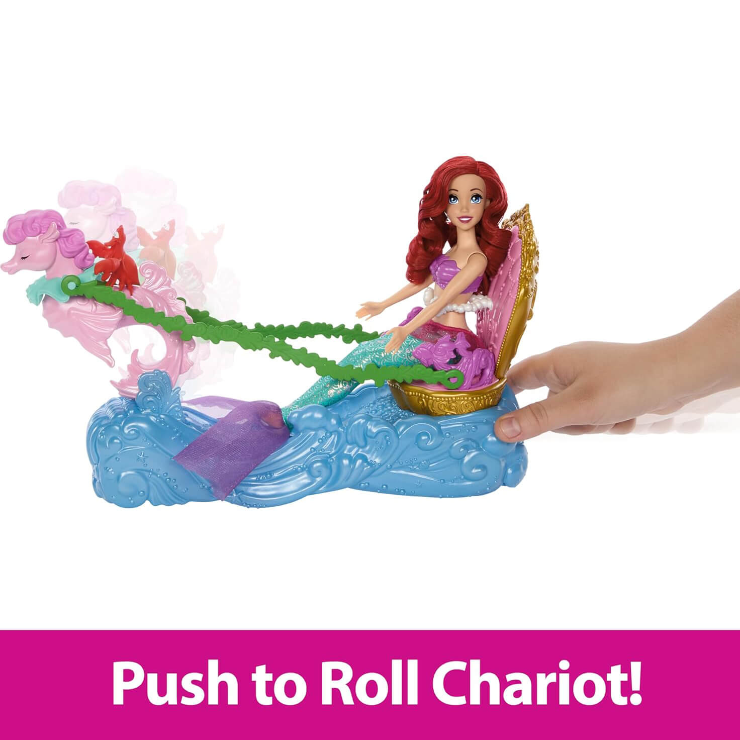 Disney Ariel is ready for a regal chariot ride around the kingdom! Inspired by Disney's The Little Mermaid, Ariel's chariot is fit for a Princessand when kids roll it forward, the seahorse moves up and down! Includes Ariel fashion doll in her mermaid look with a removable soft tail, plus crab friend Sebastian, who can attach to the chariot and join in the fun. Doll cannot stand alone. Colors and decorations may vary.