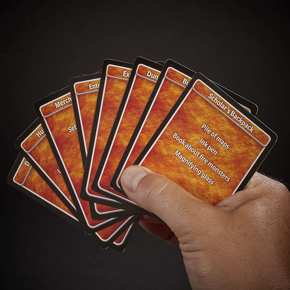 The Dungeons & Dragons Adventure Begins game includes 4 mini-figures, 4 Boss tiles, 4 20-sided dice, a 10-sided Dungeon Master die, a damage clip, 4 health trackers, a plastic deck holder, 20 character tiles, 4 dungeon boards, 24 gold, 4 adventure decks, an Item deck, 4 reference cards, 8 backpack cards, 12 gatekeeper cards, a Part stand, and game rules.