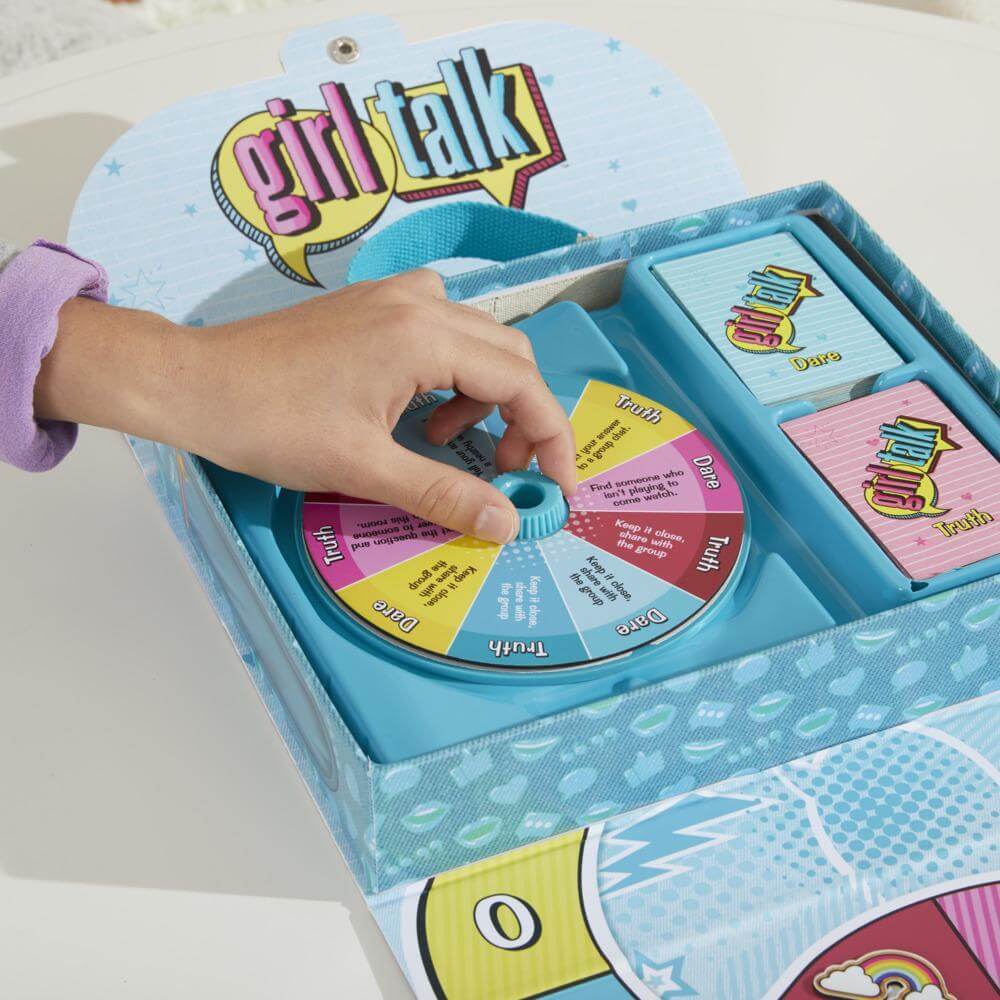 It's the truth or dare game with outrageous fun, big laughs, and silly secrets. Loved playing the classic Girl Talk game as a kid? Now you can introduce your own kids to this edition of the game, inspired by the original 1988 version. This updated board game for teens and tweens features iconic truth or dare gameplay with elements that reflect today's trends. With a nod to nostalgia, the game features colorful artwork and includes a giant central spinner. It's designed for 2-10 players and the game unit folds up into a handy portable storage case making it a great game to play at parties, sleep-overs and get-togethers for kids ages 10 and up.