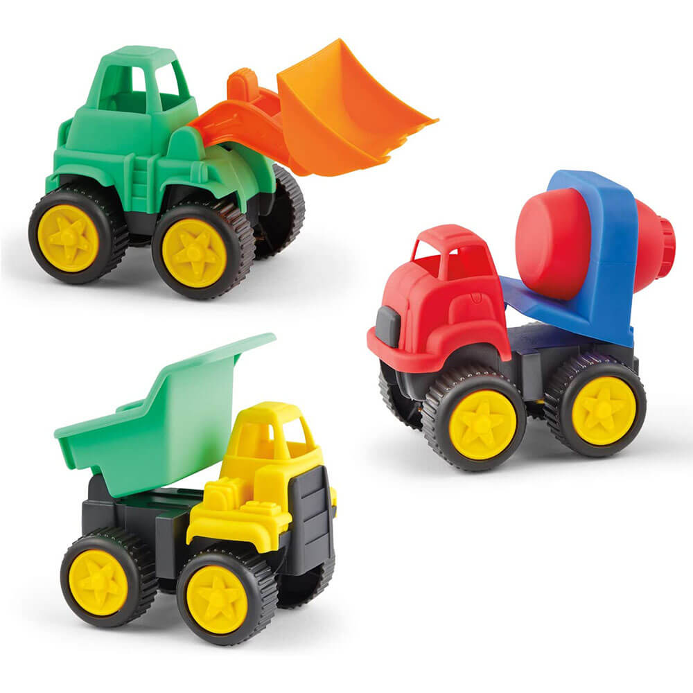 Create your own construction site with these durable, plastic trucks. Take these sturdy little trucks to the beach, in the car or just use them at home, they are convenient for any type of play. Includes 1 cement mixer, 1 bulldozer and 1 dump truck - all with real working parts! recommended for ages 12 months and older.