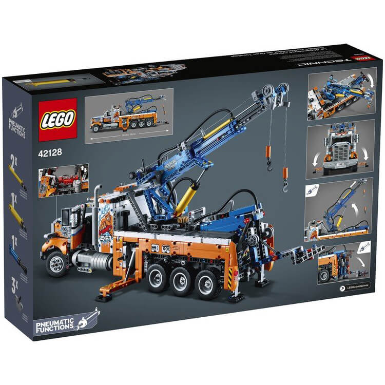 Open up the world of engineering with this LEGO® Technic™ Heavy-duty Tow Truck (42128) model. Packed with details, it’s a great tribute to the world’s best-loved tow trucks. Check out its authentic grille, air filters, lights, tailpipe, and fresh color scheme. Then explore all the pneumatic and mechanical functions that make this model so realistic.A construction toy packed with working functionsThis tow truck toy with crane is filled with impressive features. Open the hood to see the 6-cylinder inline engine with moving pistons. Steer by rotating the pin on the roof. Activate the crane, pump up the boom, pull out the winch and extend the outriggers. And for the first time in LEGO Technic history, this vehicle has a lifting axle to pull down extra wheels and spread the weight of loads.A great introduction to engineeringLEGO Technic sets feature realistic movement and mechanisms that introduce LEGO builders to the universe of engineering in an approachable and realistic way.
