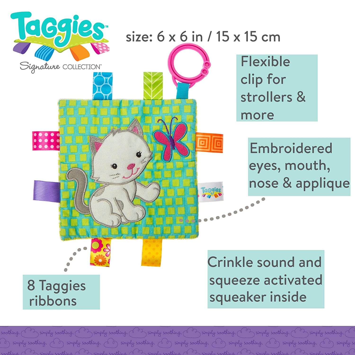 6×6″ A true standalone item. Sweet, expressive face. Part soother, part activity toy. Fun character appliques and colorful patterns on the outside. Crinkle sound and squeeze activated squeaker inside. Flexible loop clip for attaching to stroller, cribs and more. 8 Taggies ribbons. All embroidered details. BPA, PVC, and Phthalate free. Machine wash, air dry