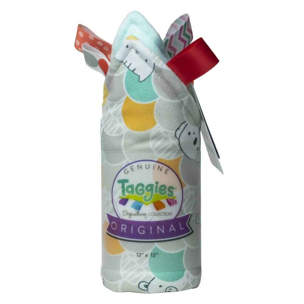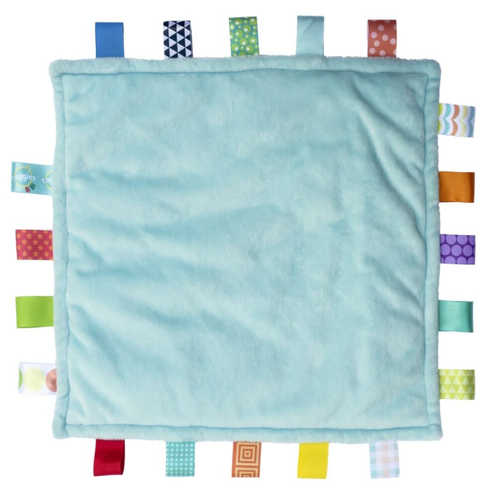 12×12″ Patterned jersey front side. Soft plush backing. 20 looped Taggies ribbons. Clear banded packaging for easy print viewing. Machine wash, air dry.