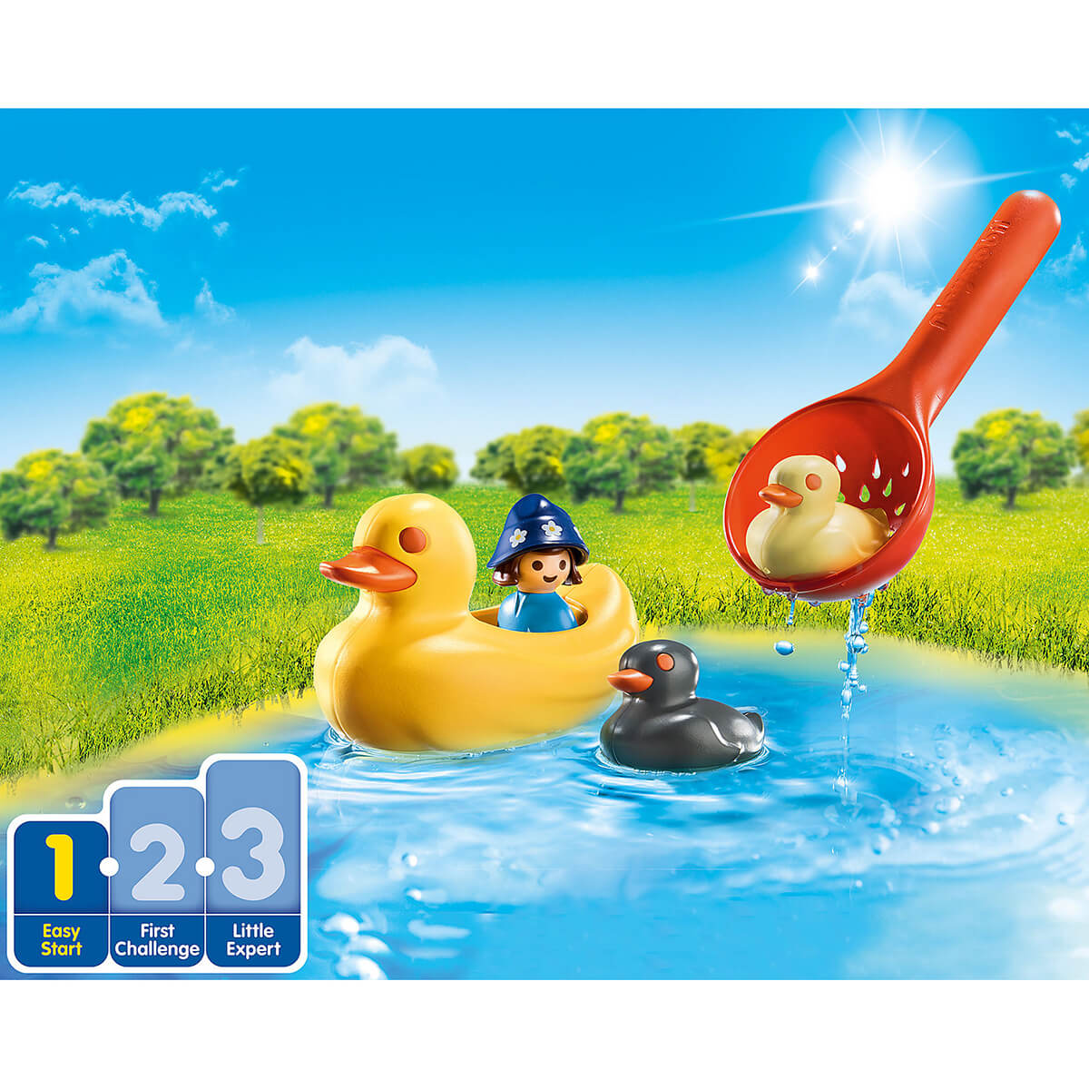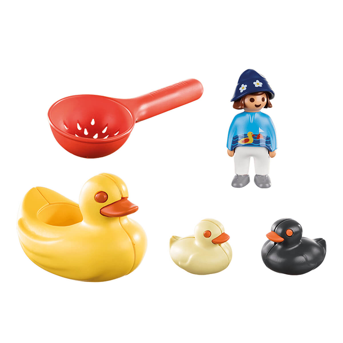 Explore the pond and watch the Duck Family swim along. The colorful playsets from PLAYMOBIL 1.2.3 AQUA each promote important developmental skills. This Stage 1 - Easy Start set will help your toddler develop language and fine motor skills, all while having a great water play experience! Sit in the duck boat and use the scoop to pick up the floating ducks. Combine this set with the Splish Splash Water Park (#70267 - sold separately) for even more fun. Set includes one child figure, duck boat, two ducks, and scooping spoon. Recommended for ages 18 months to four years.