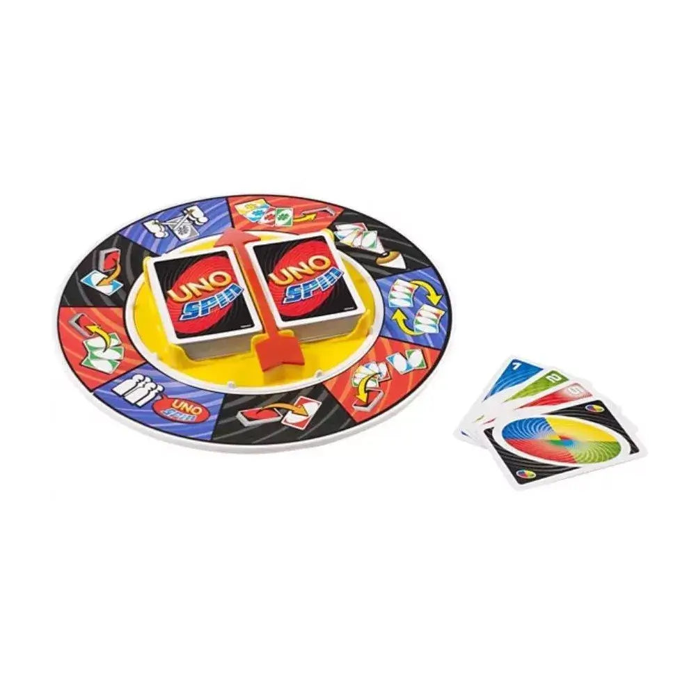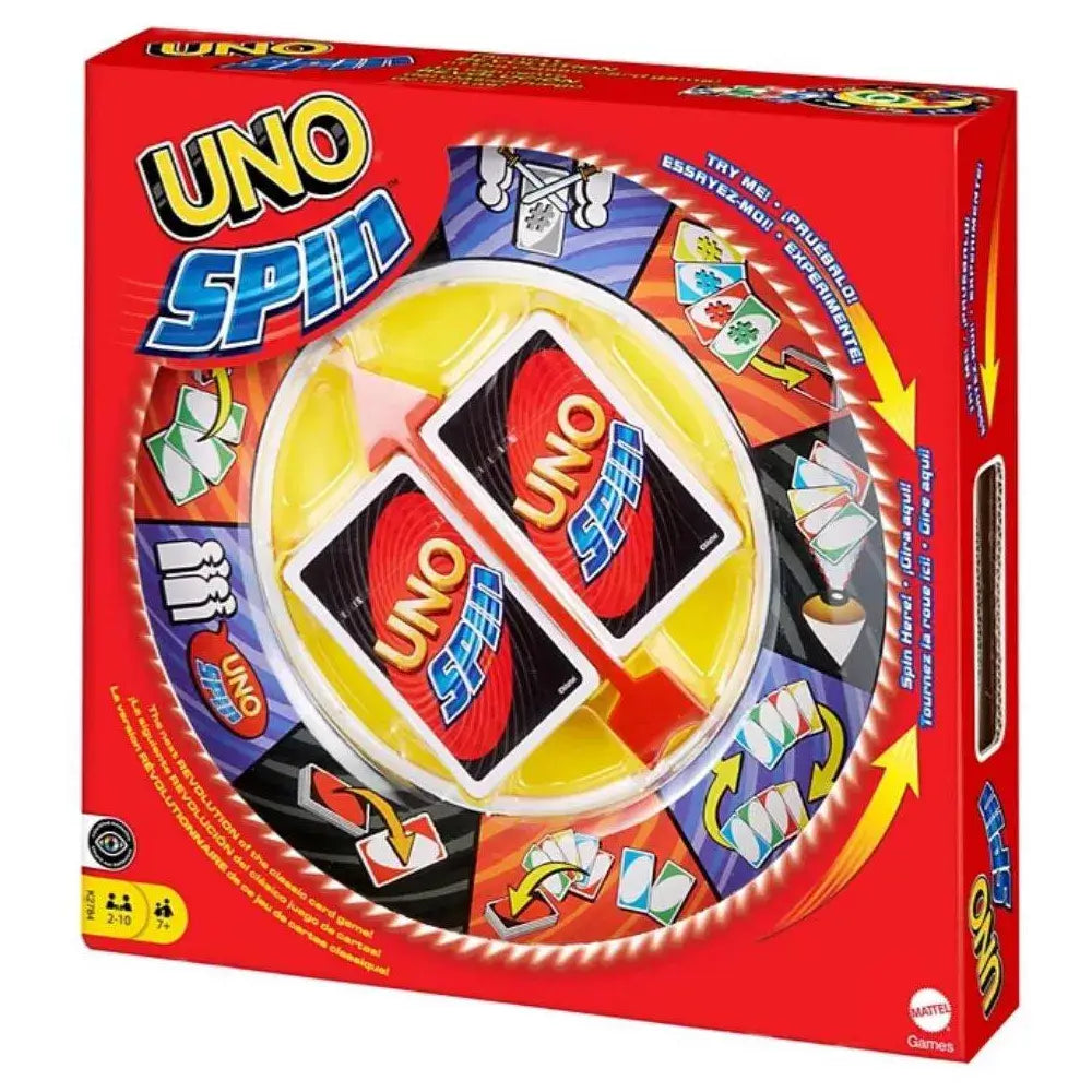 The UNO classic card game goes revolutionary! When a spin card is played, someone must spin the wheel. In a single turn, everything can change! Players can come from behind and suddenly take the lead. It's fast-paced fun that'll make your head spin! Includes one UNO Spin wheel and 112 UNO Spin cards and instructions. Features: The UNO classic card game goes revolutionary! In a single turn, everything can change! When a spin card is played, someone must spin the wheel. Players can come from behind and suddenly take the lead.