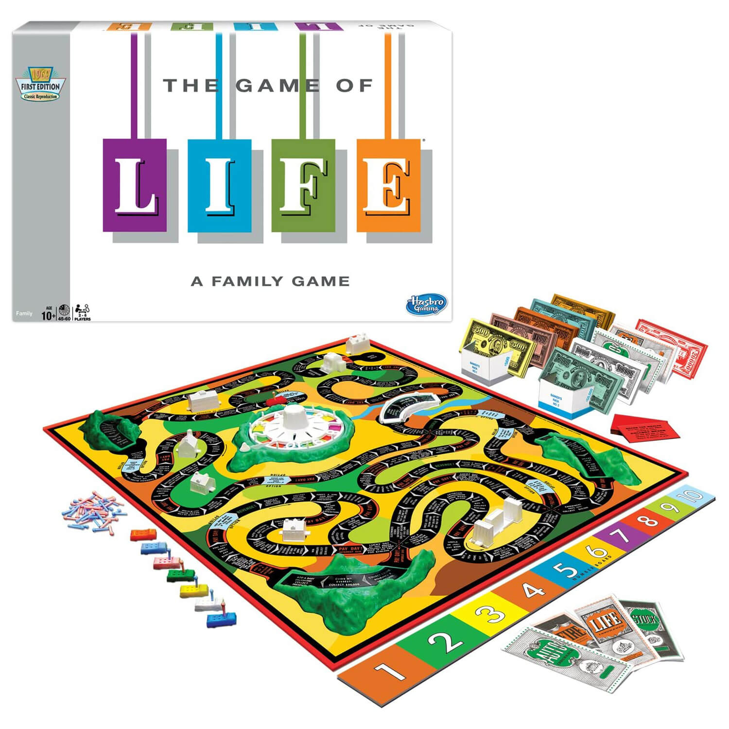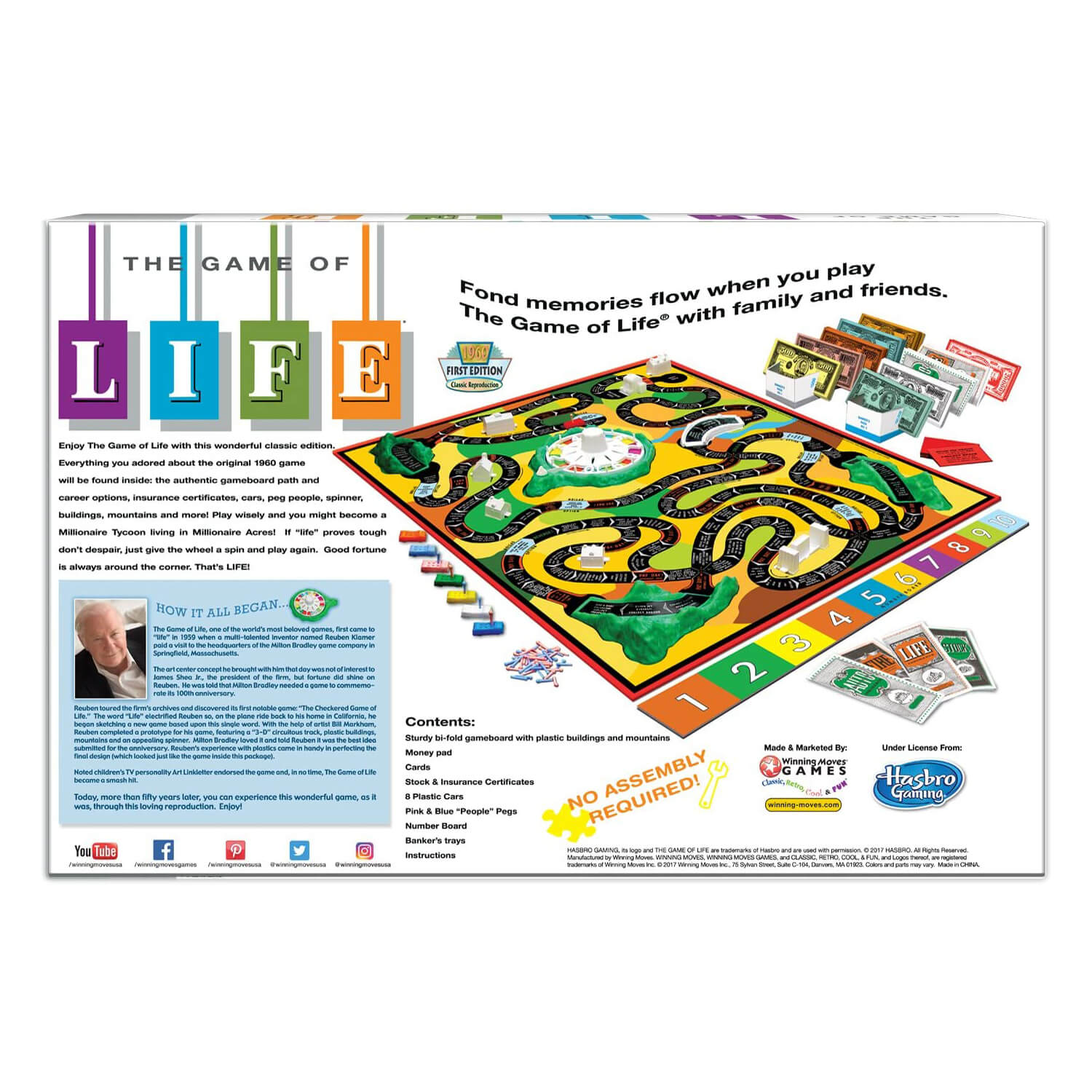 Celebrate the 50th Anniversary of The Game of Life with this wonderful classic edition. Everything you adored about the original 1960 game will be found inside. Good fortune is always around the corner. That's LIFE! Contents include sturdy bi-fold game board with plastic buildings and mountains, money pad, cards, Stock & Insurance Certificates, 8 plastic cars, pink & blue “People” pegs, number board, banker’s trays and rules.