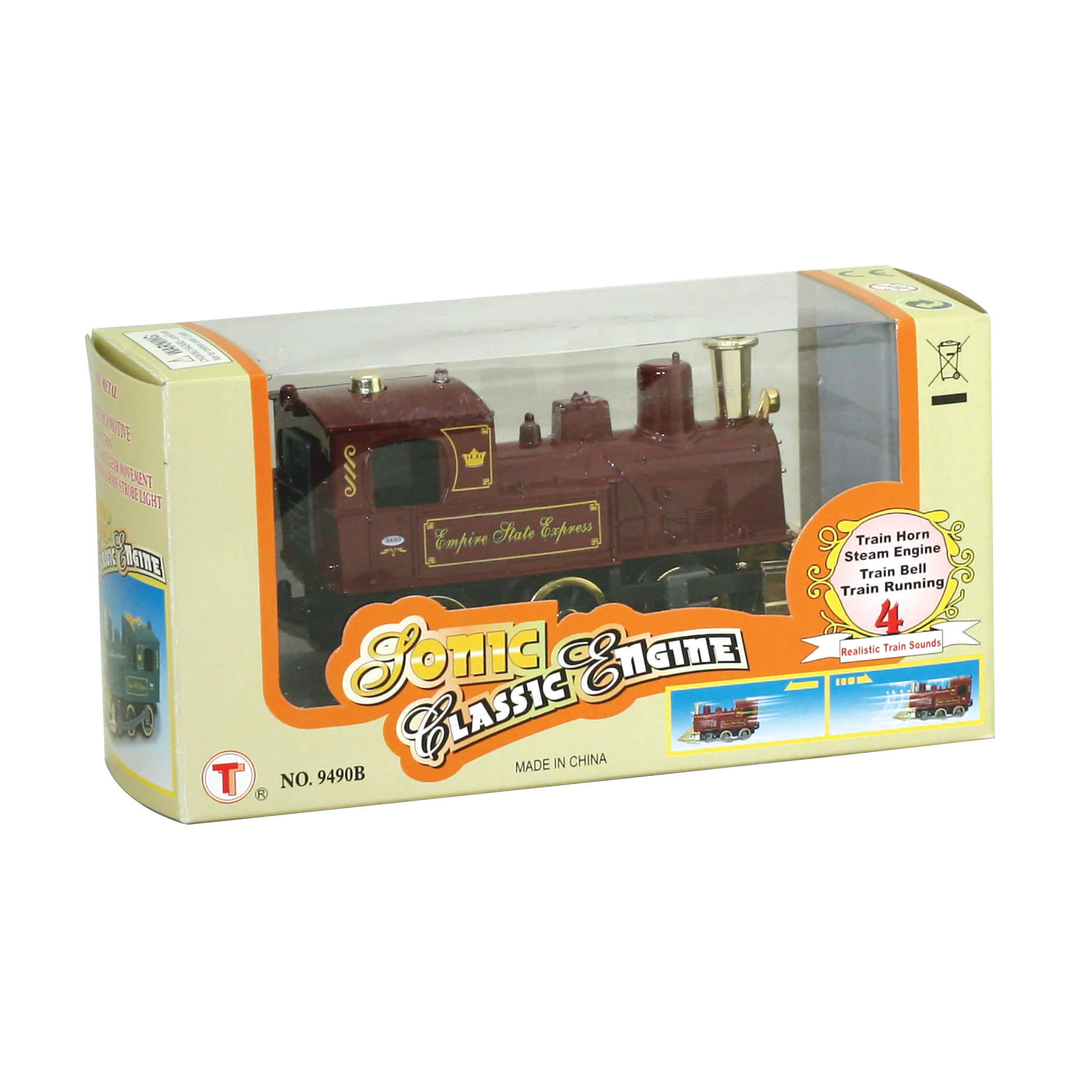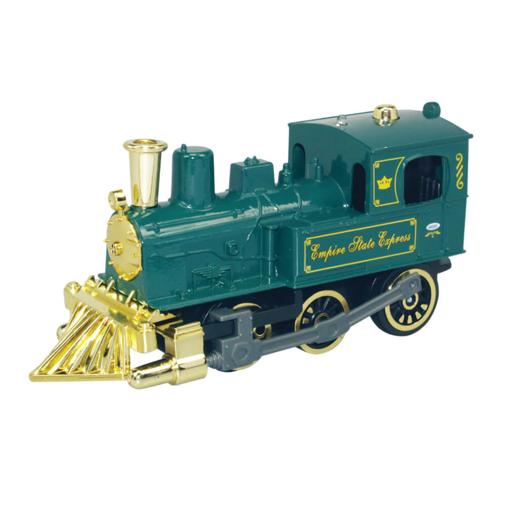 Real enthusiasts will love this classic steam engine made from sturdy die-cast metal. It features pullback action, working side rails, a flashing light and traditional locomotive sounds. Measures 5" long. Comes in green, black and red.