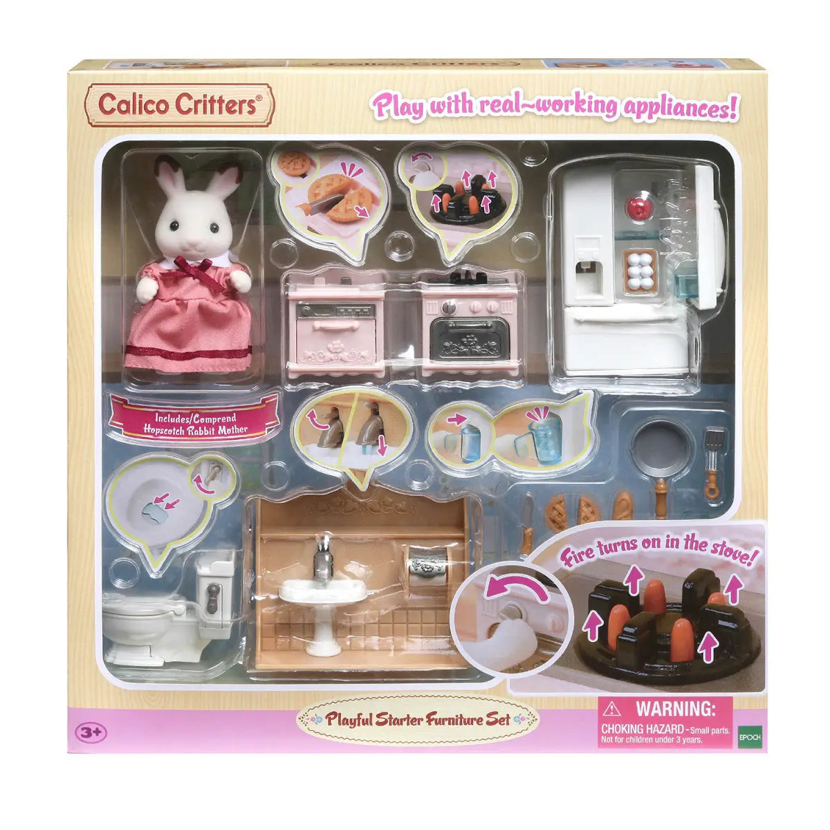 Calico Critters Playful Starter Furniture Set is a quintessential starter set for any Calico Critters dollhouse. This beautifully detailed and high quality set is ready to play and includes 3" Hopscotch Rabbit Mother Heidi, and kitchen and bathroom furniture. Unique to this furniture set are the functional features including a sink with running water, flushable toilet, refrigerator with ice dispenser and more. Box Includes Playful Starter Furntiure Set. Furniture is 1:24 scale.