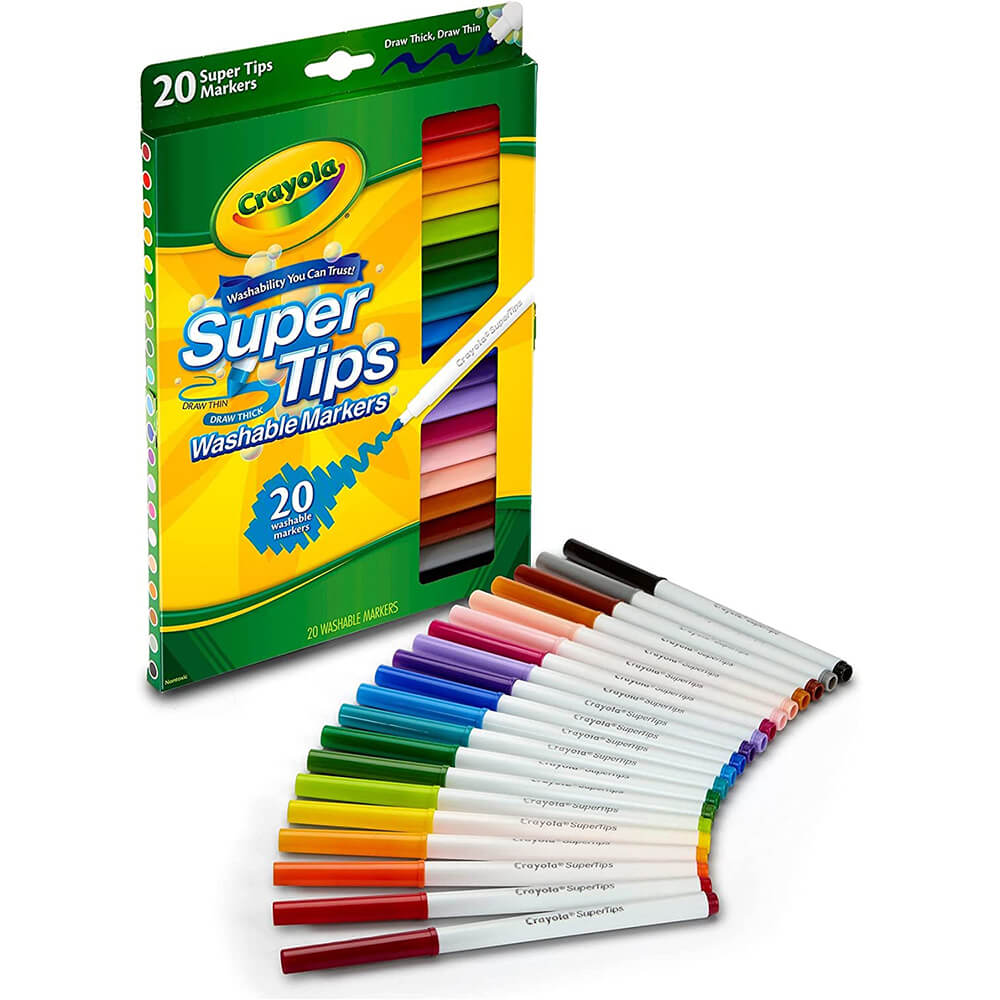 Crayola Super Tips Markers in the 20ct box are a great complement to kid and adult coloring books. These washable markers offer a variety of vibrant and bold colors that will wash clean from skin and most washable clothing. Super Tips are a unique coloring tool because of their specially designed marker tip, which can be used to create thick and thin lines. This makes them a preferred tool for practicing hand lettering and creating detailed DIY crafts. Pair this marker set with a Hand Lettering Tutorial for a great gift idea. It's perfect for birthdays, holidays, and everyday creative play.
