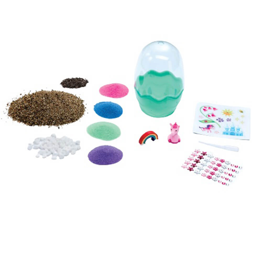 Contents Include: plastic egg terrarium, potting mix, water dropper, sticker sheet, colored sand (red, blue, orange), white gravel, unicorn figure, rainbow figure, adhesive back rhinestones