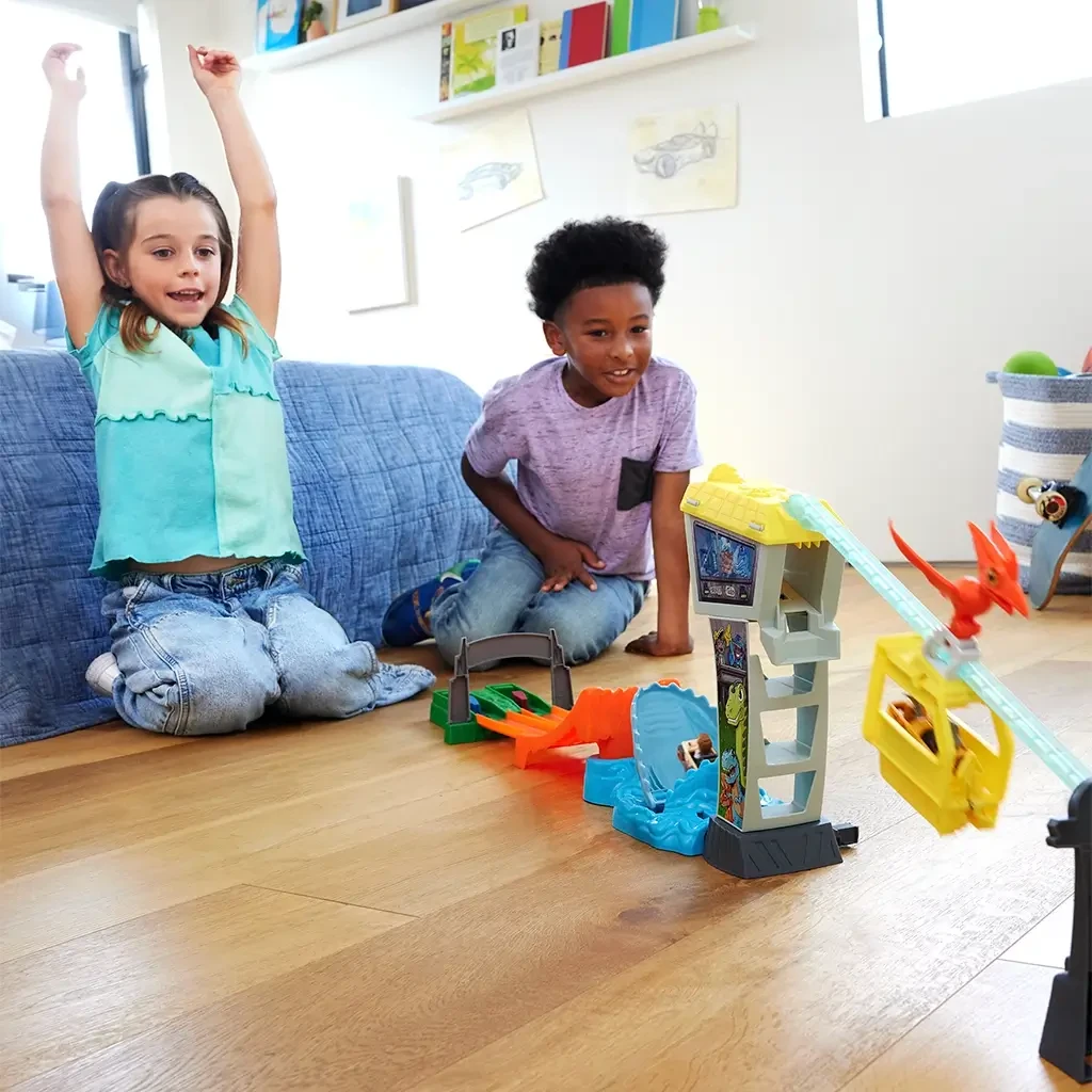 Race to escape Jurassic World island in this Hot Wheels RacerVerse track set that features a drag race and a zipline at the finish. It includes die-cast racers Blue the Raptor and Owen with non-removable figures in the drivers' seats of die-cast Hot Wheels vehicles that are primed for track racing. The fastest racer will make it to the watchtower and zipline to safety while their opponent will fall into the open mouth of the awaiting Mosasaurus. The set folds in half for easy storage. Color and decorations may vary.