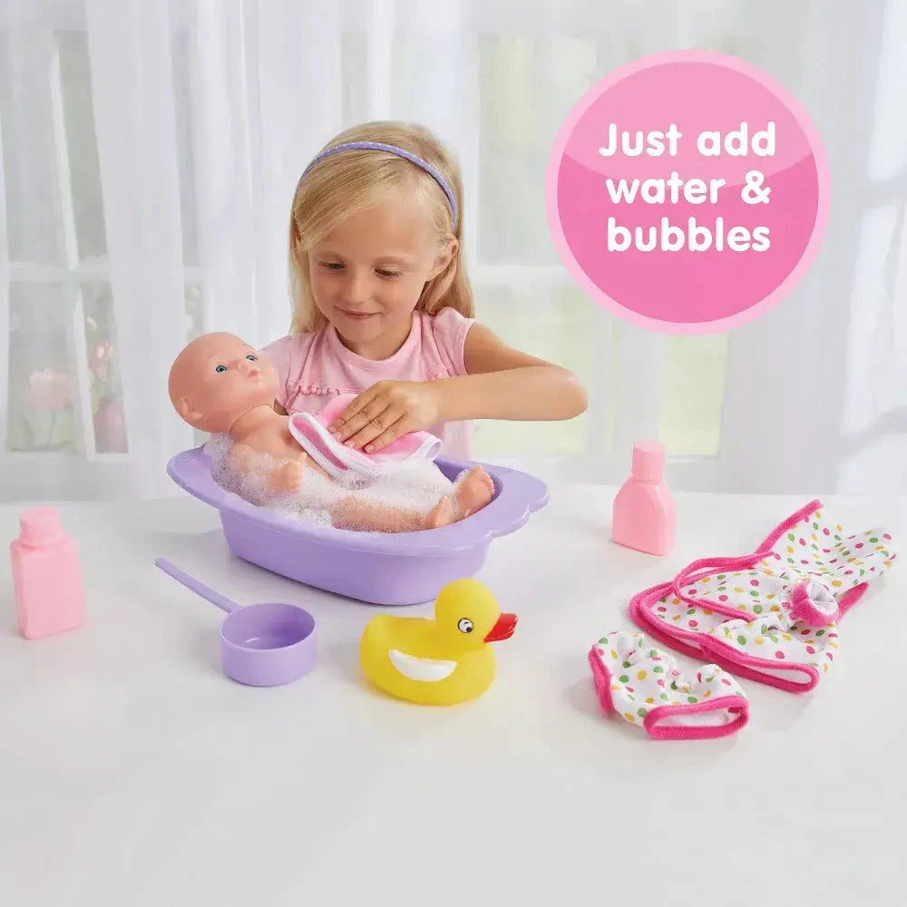 Kids don't always want to take a bath, but a little friend might make it more enjoyable. They'll learn the importance of keeping their baby clean, in hand teaching them responsibility for their own hygiene. Maybe your child is ready for a new baby in the family, but you aren't. The Bathtime Baby Doll is the perfect solution. They can be just like you, caring for a new little one, giving them a bath and caring for them. Early learning isn't all just colors, shapes, and numbers, but also emotions. The Bathtime Baby Doll is the perfect toy to help your child foster their emotional development. They can connect with a toy, caring for and loving it like a real baby. Kidoozie toys are engaging, educational and FUN. Our broad range of high-quality toys have won numerous awards and are safe and well designed. Innovative toys encourage movement, problem-solving and pretend play through various themes. Stimulate the imagination and enable learning through play. Package contains (1) Kidoozie Bathtime Baby Doll - 9 Piece Set. Includes doll, bathtub, rubber duckie, washcloth, two bottles, scoop, robe, and underwear. Recommend for children ages 3 years and older.