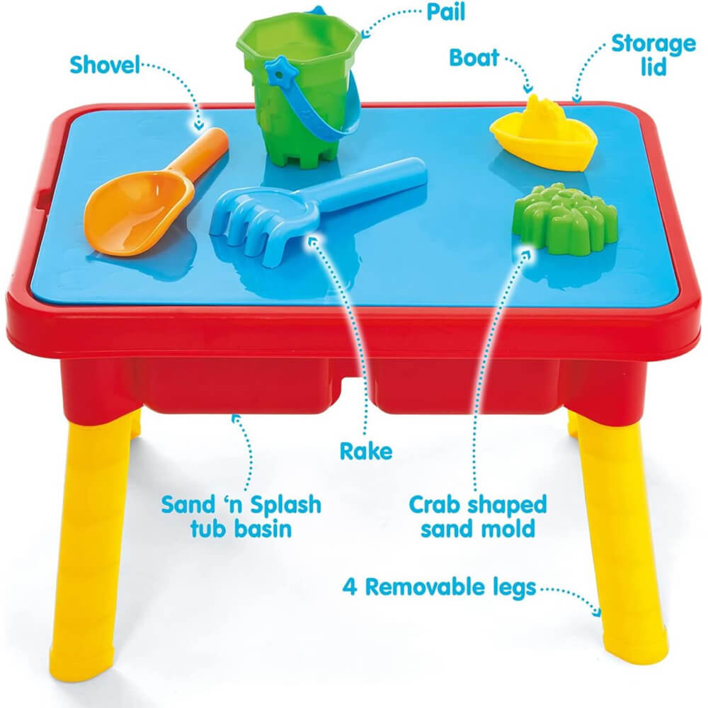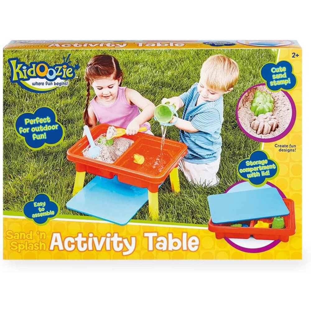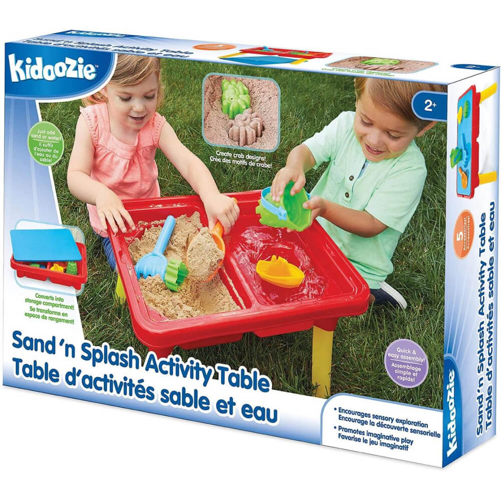 - Product Specifications: Package contains (1) Kidoozie Sand ‘n Splash Activity Table. Includes table with sand and water wells and removable legs, lip, bucket, shovel, rake, boat, and crab sand stamp. Recommended for children ages 2 years and older.