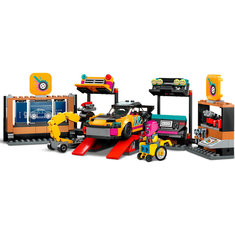 Welcome to the LEGO® City Custom Car Garage. Use the smart configuration wall to create awesome designs. Help the mechanics fit cool headlights, rear spoilers and bumpers for rallying and drift racing. Drive vehicles onto the ramps for modification, painting and welding. Use the hoist to install different engines and visit the tuning station before you hit the road. This workshop is awesome!