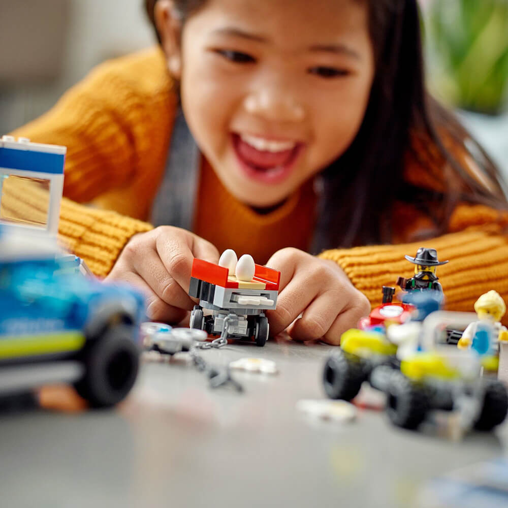 Kids can create their own LEGO® City Adventures TV series stories with the LEGO City Police Mobile Command Truck (60315) playset. It’s packed with awesome features, exciting functions and cool vehicles, including a toy police pickup and trailer with a jail, drone and ATV, plus a crooks’ tractor and trailer with an egg-splat launcher. Just add the Duke DeTain, Gracie Goodhart and Snake Rattler minifigures and let the fun begin! Designed for kids aged 6+ This LEGO construction set includes a step-by-step printed building guide and interactive digital building instructions. Available in the free LEGO Building Instructions app for smartphones and tablets, the digital guide comes with intuitive zoom and rotate tools that allow kids to visualize the models from all angles as they build. The inspiring world of LEGO City LEGO City playsets deliver an enjoyable build-and-play experience with feature-rich buildings, realistic vehicles and fun characters that inspire imaginative, open-ended play.