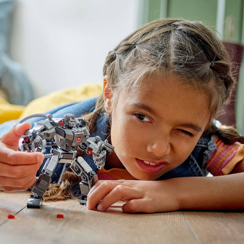 Buildable LEGO® Marvel War Machine mech figure, fully jointed for dynamic action, with 3 stud shooters, an ammunition backpack and a minifigure pilot.