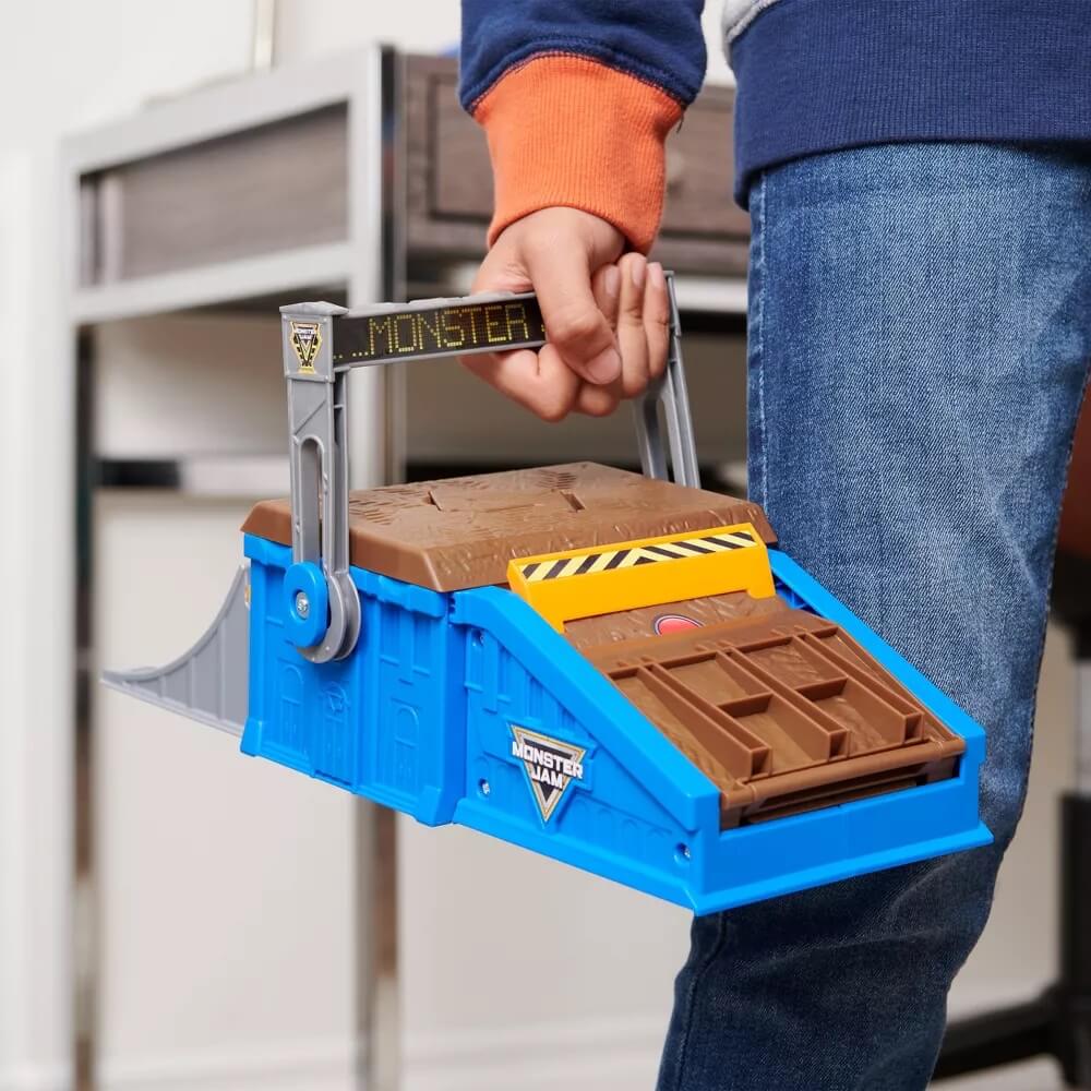 Bring the Monster Jam action wherever you go with the Monster Jam Mini Freestyle Flip Arena Playset! This playset features 2 Monster Jam Mini Trucks – El Toro Loco and Max-D! Show off the awesome details and graphics. Use the ramp to launch your monster trucks into the air. Perform front flips, black flips, high jumps and more! Celebrate your victory by revealing the hidden trophy! When you’re done playing, fold up your transforming playset into a portable carrying case by securing the lid and lifting the handle. It can store up to 12 mini Monster Jam trucks! It’s the best way to store your Monster Jam mini trucks! Monster Jam monster truck toys are the perfect gifts for kids ages 3 and up. Bring the Monster Jam action wherever you go with the Monster Jam Mini Freestyle Flip Arena!