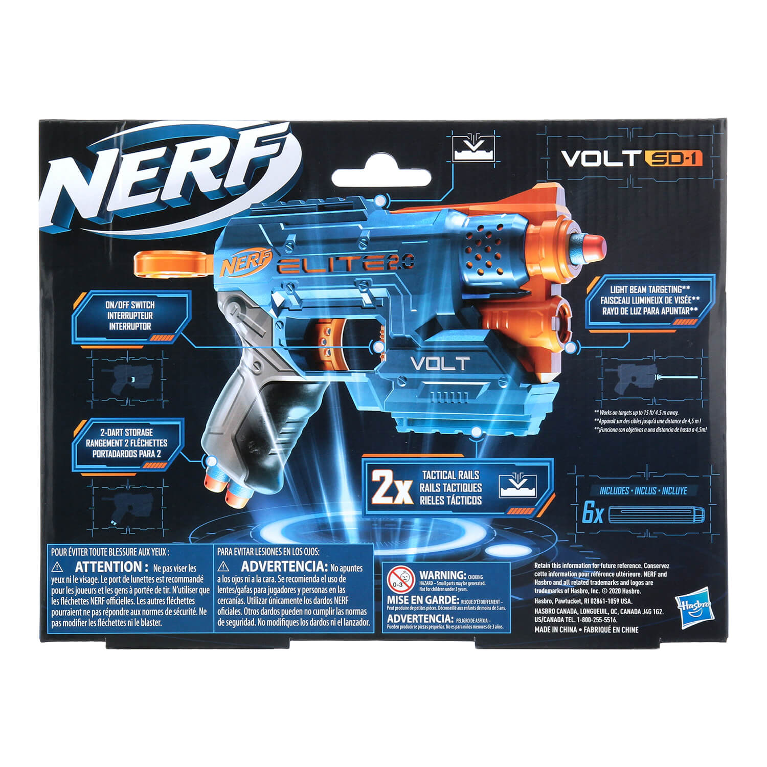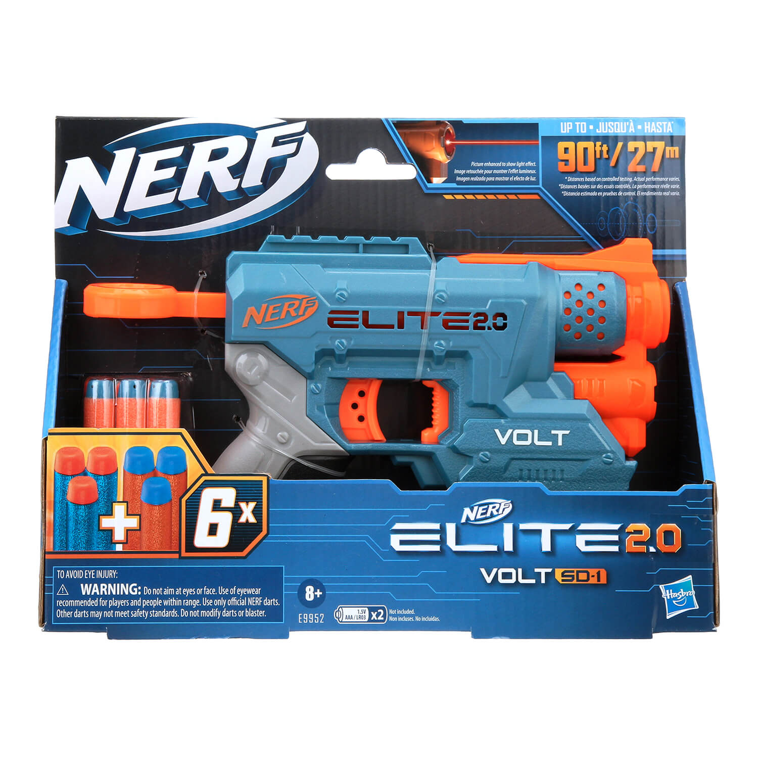 The Nerf Elite 2.0 Volt SD-1 blaster is equipped with 2 tactical rails so you can customize it with Nerf accessories for each mission or battle. Switch on the light beam to enhance your targeting capability even in low-light situation. The beam works on targets up to 15 feet (4.5 meters) away. This single-shot blaster has storage for 2 darts in the handle. Includes 6 Official Nerf darts for multiple reloads. Fires darts up to 90 feet (27 meters). Eyewear recommended. Requires batteries. Eyewear, batteries, and additional accessories not included.