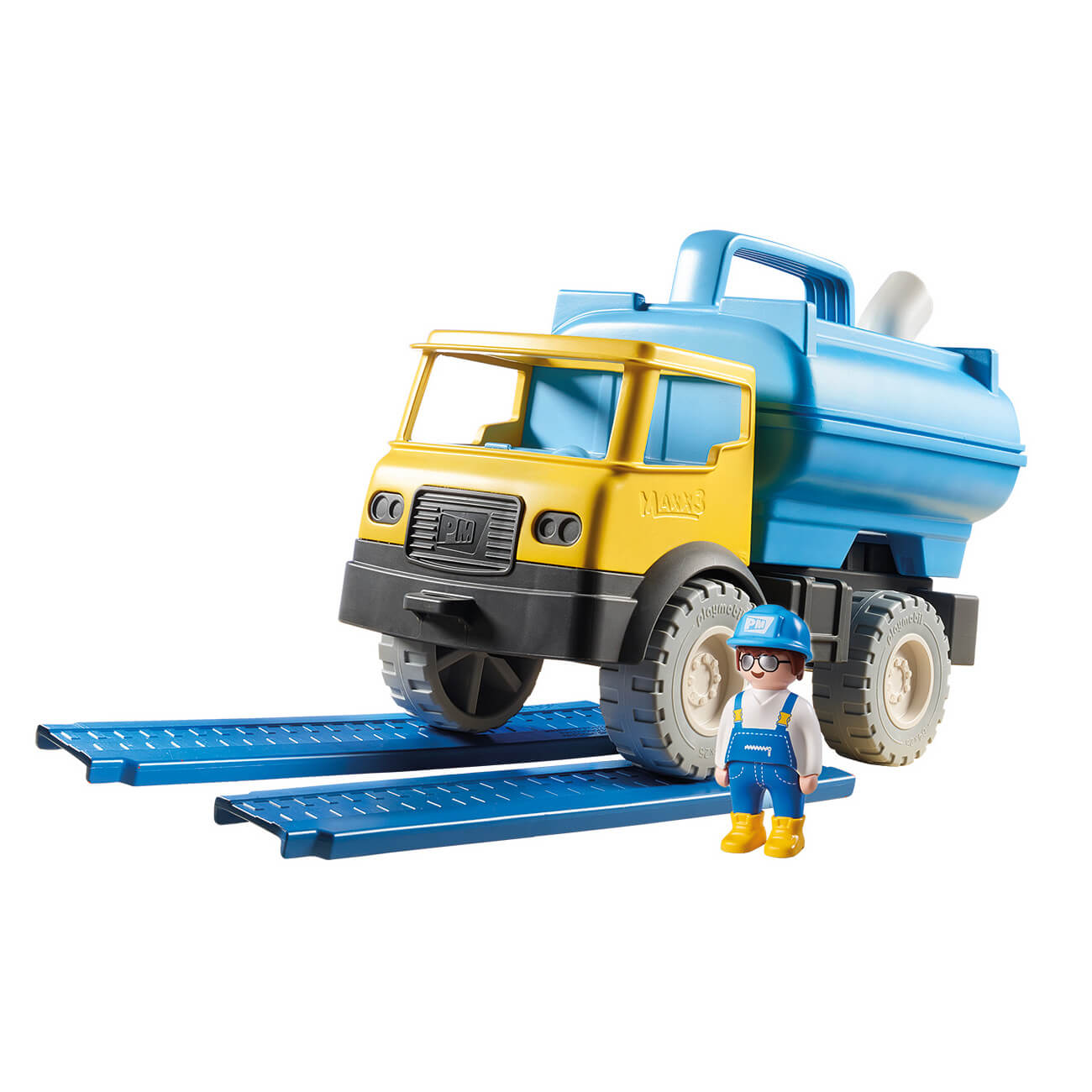 When the job calls for tons of water, the Water Tank Truck is up for the challenge! Simply load up the tank with water and push this heavy-duty sand vehicle across the sand to your beach construction site to get the water needed. With the help of the included tracks, the truck’s wheels will roll easily without getting stuck in the sand. Then, detach the water tank by sliding it off the truck bed and using it as a watering can. For even more fun, use the two ramps as gullies or bridges to expand the game possibilities. Not at the beach? No problem! This vehicle is suitable for both playing outside in the sandpit and inside on the carpet as kids imagine the next beach day. The truck cab can accommodate up to two PLAYMOBIL 1.2.3 figures. Set includes one construction worker, truck with water tank, removable spout, and two ramps. Dimensions: 10.8 x 4.7 x 7.6 in (LxWxH). Recommended for ages two years and up.