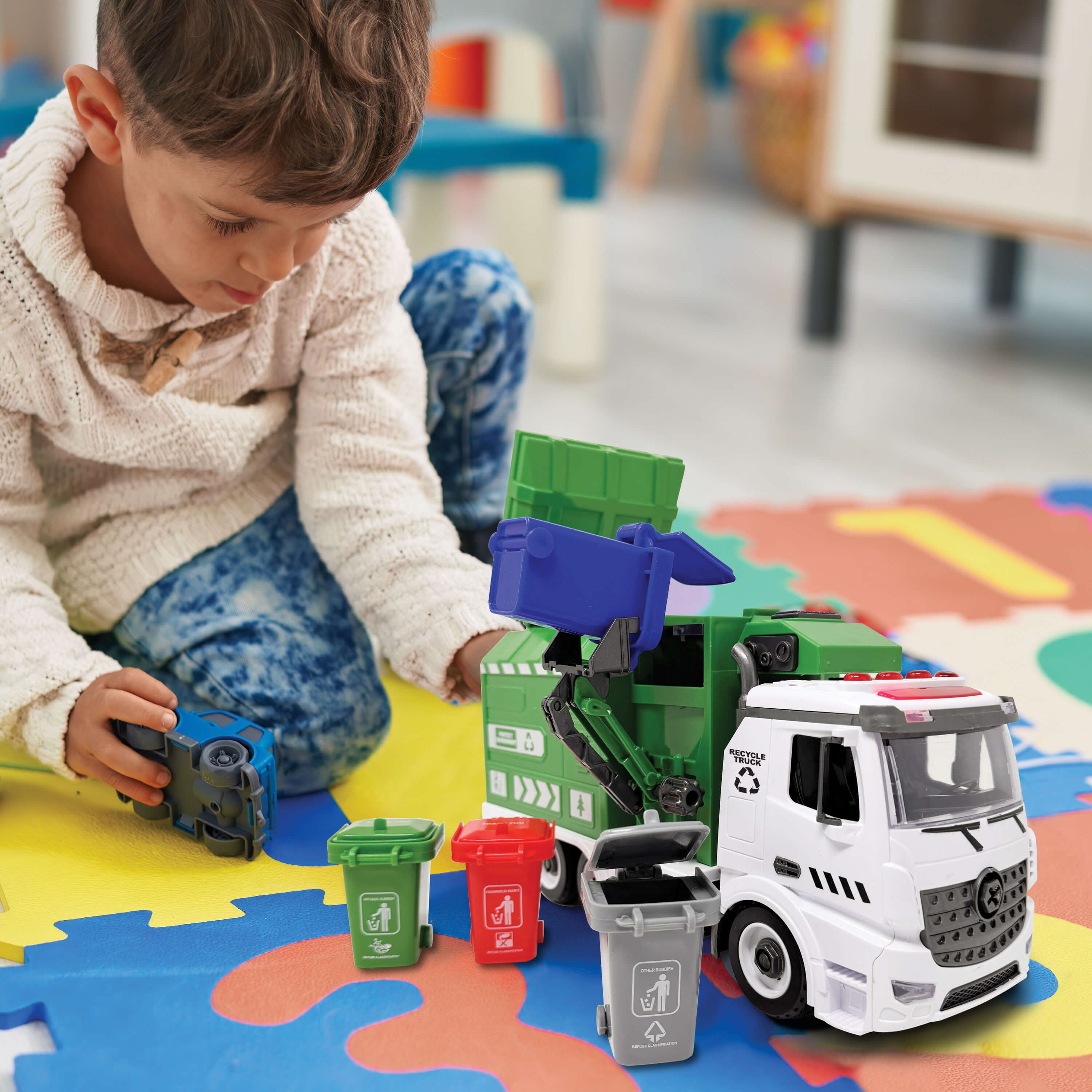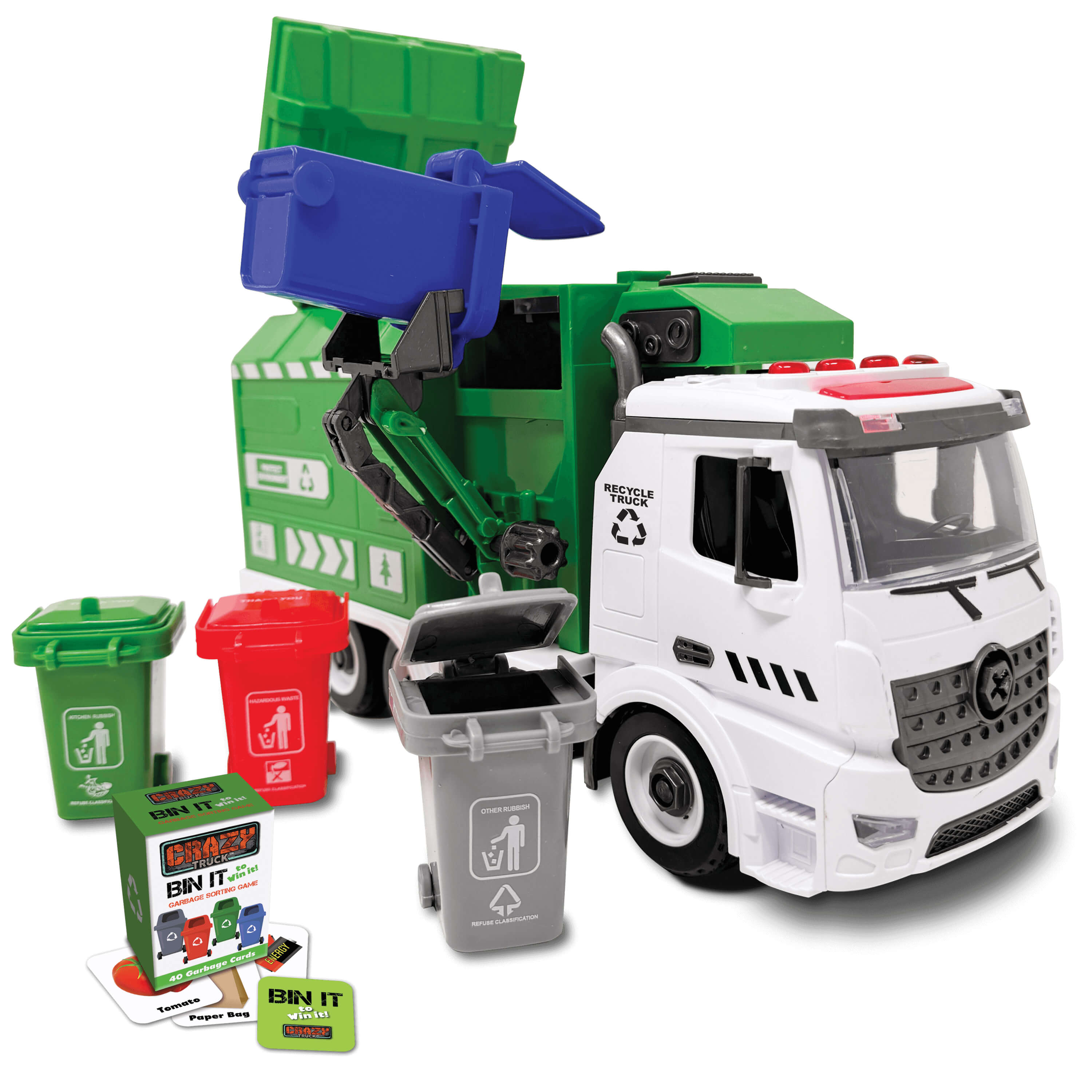 The truck includes a movable arm that lifts and dumps trash, just like a real recycling vehicle. Children can also use the included tools to take the truck apart and put it back together, promoting problem-solving skills and fine motor development. To make learning even more fun, the set comes with 40 flashcards for a "Bin it to Win it" sorting game that teaches the basics of recycling in a playful way.