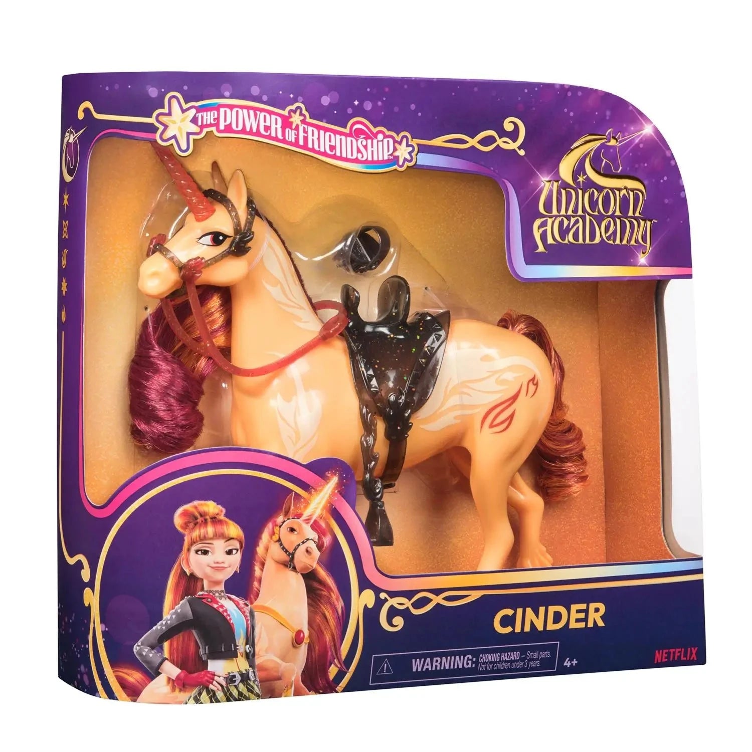 Celebrate the Power of Friendship from Unicorn Academy with Valentina`s unicorn, Cinder. Inspired by the NETFLIX animated show and best-selling book series where friendship reins, this 11-inch unicorn toy brings fiery Cinder to life. Beautifully detailed, Cinder features metallic Fire Magic power markings on his side, a glittery horn, colorful mane and tail, and translucent removable bridle and saddle doll accessories for added play. Gently move Cinder`s head to bring out his personality and relive the magical bonding experience between unicorn and rider with Valentina. Brush Cinder`s soft mane and tail and ride into adventure to protect Unicorn Island and its magic. For more ways to experience Unicorn Academy with your favorite characters, look for all of the dolls and their unicorns (toys each sold separately) and expand your world. The friendships and magical bonds between Unicorn Academy students and their unicorns will spark endless imaginative storytelling. For kids who enjoy unicorns and horse toys, dolls & accessories, doll house play, collectibles, plush toys and more, Unicorn Academy toys are fun birthday gifts for girls or gifts for any occasion. Bring home the magic of Unicorn Academy with the Power of Friendship-themed Cinder.
